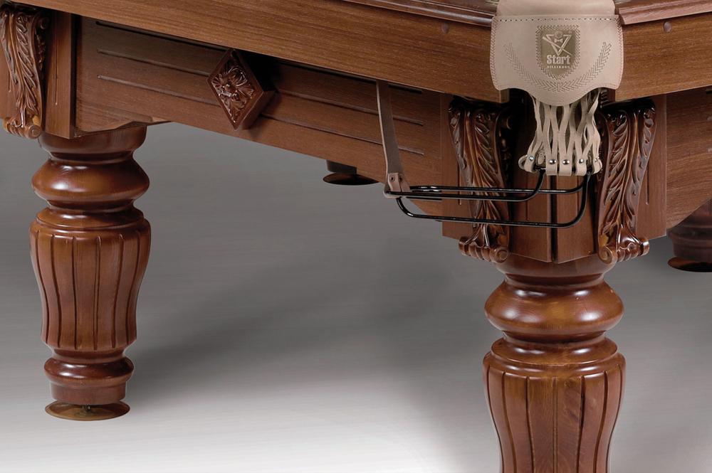 Современные технологии производства профессиональных столов, используемые в конструкции этой модели, органично вписываются в аристократичный классический дизайн с подчеркнуто строгими линиями. Лафет из деревянного массива сосны, покрытый шпоном ясеня или дуба, склеен из специальных брусков. Такая технология позволяет добиться идеальной жесткости – стол прослужит долгие годы в отличном состоянии. Резиновые амортизаторы бортов Start Super Pro рекомендованы ФБСР.