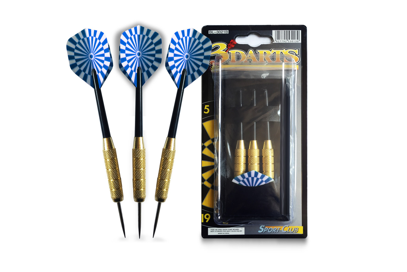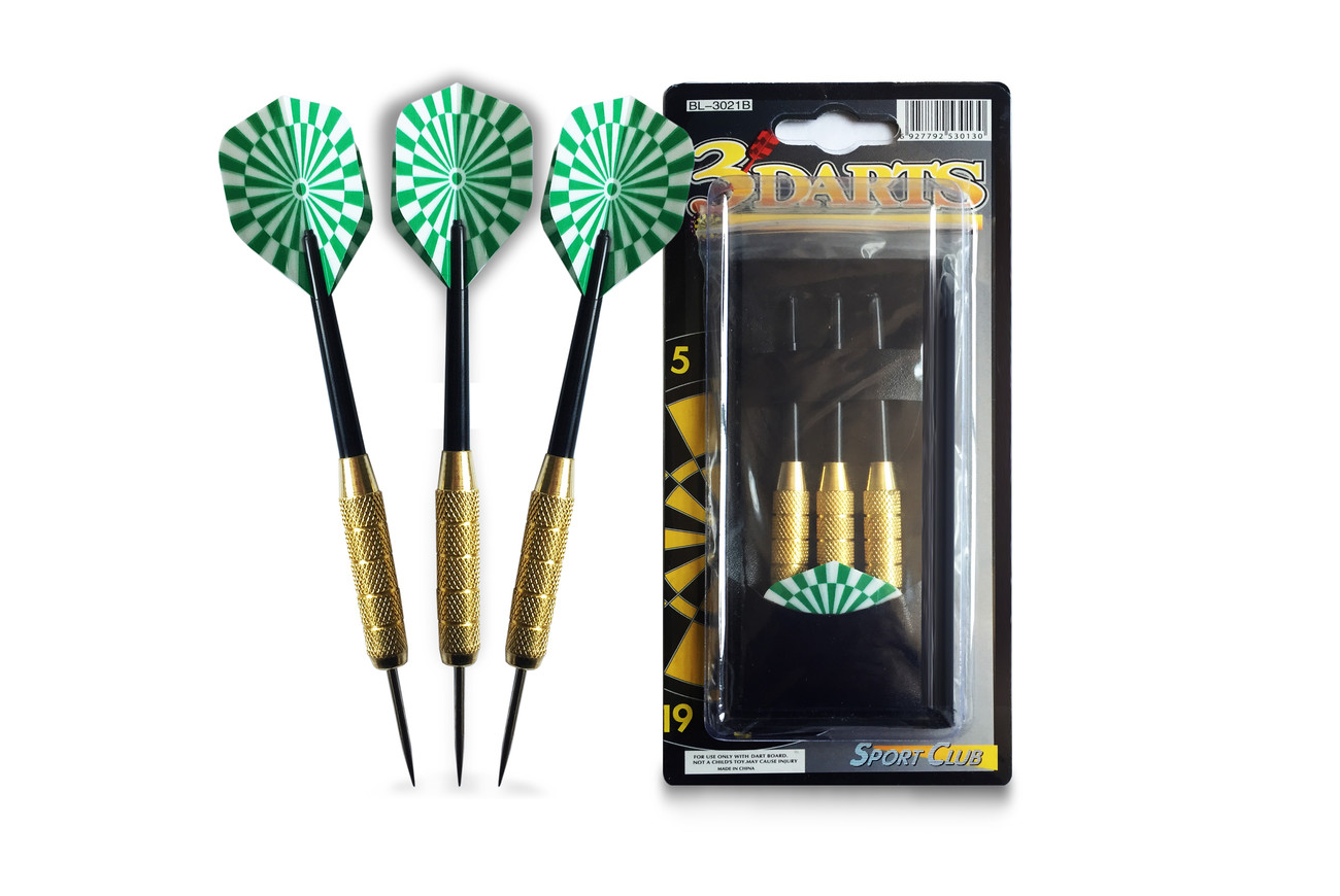 Комплект включает собранные дротики с латунным покрытием высокого качества 6 шт x 18 гр (3 дротика с синим хвостовым оперением и 3 с зеленым хвостовым оперением), а также крепление для подвешивания к стене.